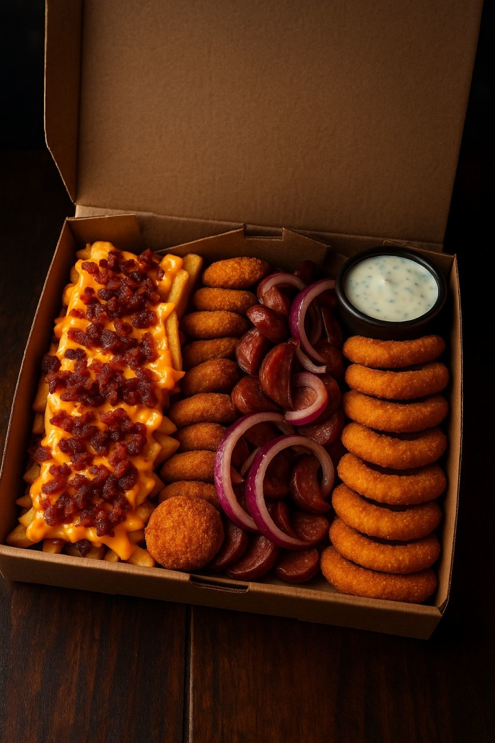 - calabresa, batata cheddar e bacon, nogguts e onions rings (cebola empanada)