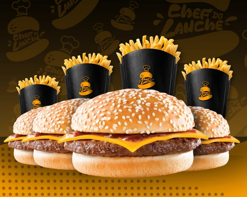 Delicie-se com nosso 'Combo Família: 4 Cheddar Duplo'. Uma saborosa combinação de 4 hambúrgueres duplos com duas carnes de 90g artesanais, todos generosamente cobertos com duas camadas de cheddar fatiado e acompanhados por um suculento molho cheddar gourmet. Cada hambúrguer é cuidadosamente montado com duas saborosas carnes, acomodadas em pães Pullman fresquinhos. Para um toque especial, adicionamos cebola caramelizada e defumada, trazendo uma explosão de sabor. O combo também inclui 4 porções de fritas crocantes. Bebidas e sobremesas podem ser adquiridas à parte para complementar sua refeição.