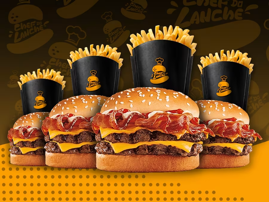 São 4 Lanches compostos por dois hambúrgueres artesanais de 90g cada, feitos com carne suculenta e altamente saborosa. Além disso, é repleto com duas generosas fatias de queijo cheddar derretido, proporcionando um sabor irresistível. Mas o verdadeiro protagonista é o nosso 'Bacon', crocante e bem temperado, acompanhado de um delicioso e adocicado molho barbecue. Um lanche que promete uma experiência gastronômica inesquecível!, além dos 4 Burger acompanha as 4 porções de fritas da casa, bebida e sobremesa são adicionadas a parte