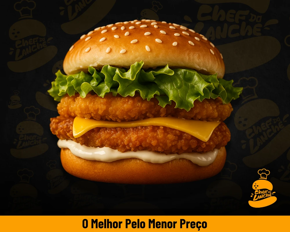 O 'Chef Chicken Duplo' é um lanche majestoso da categoria 'Lanches e Combos'. Esse prato de alta qualidade apresenta dois suculentos hambúrgueres de frango, cada um pesando 100g, cuidadosamente acomodados em um leito de alface americana fresca e crocante. A essência pungente da cebola, aliada à doçura do tomate maduro, enriquece ainda mais o sabor. A coroação deste magnífico prato é uma generosa porção de queijo cheddar fatiado, derretido até a perfeição. Para finalizar, um toque especial de molho grill, similar ao icônico molho do Bk, acrescenta um sabor maravilhosamente intenso e irresistível!