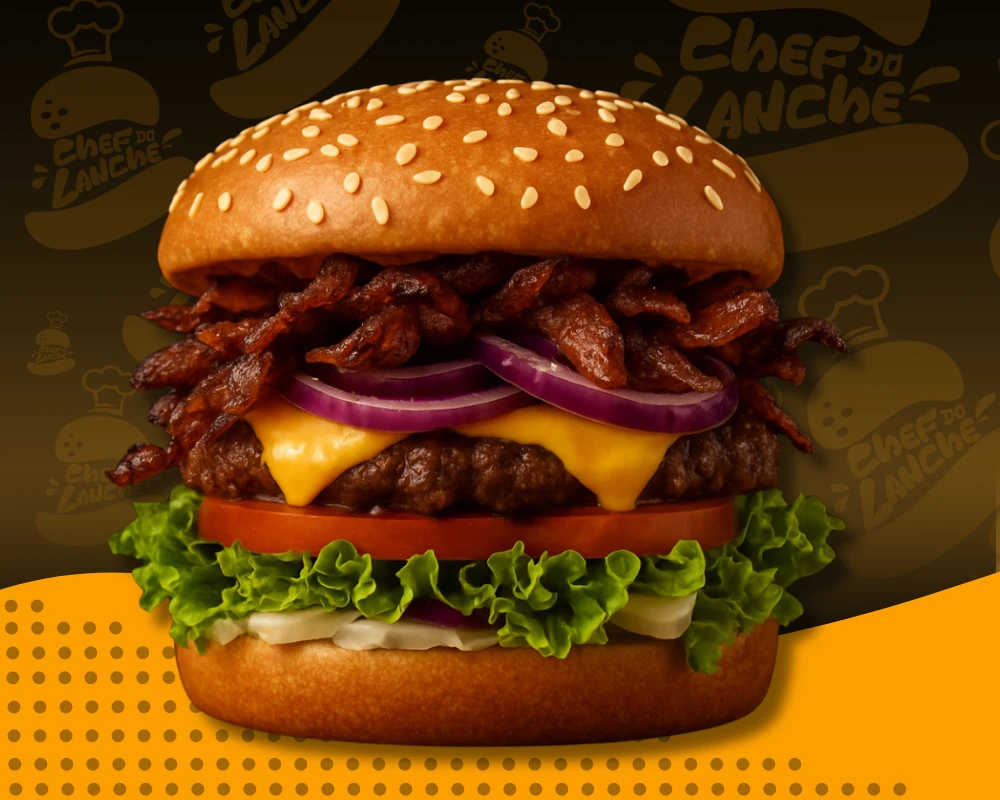 Pão de gergelim 50g, carne artesanal 90g, queijo cheddar fatiado, bacon especial e molho barbecue Na tampa do pão vai alface americano, tomate e cebola roxa